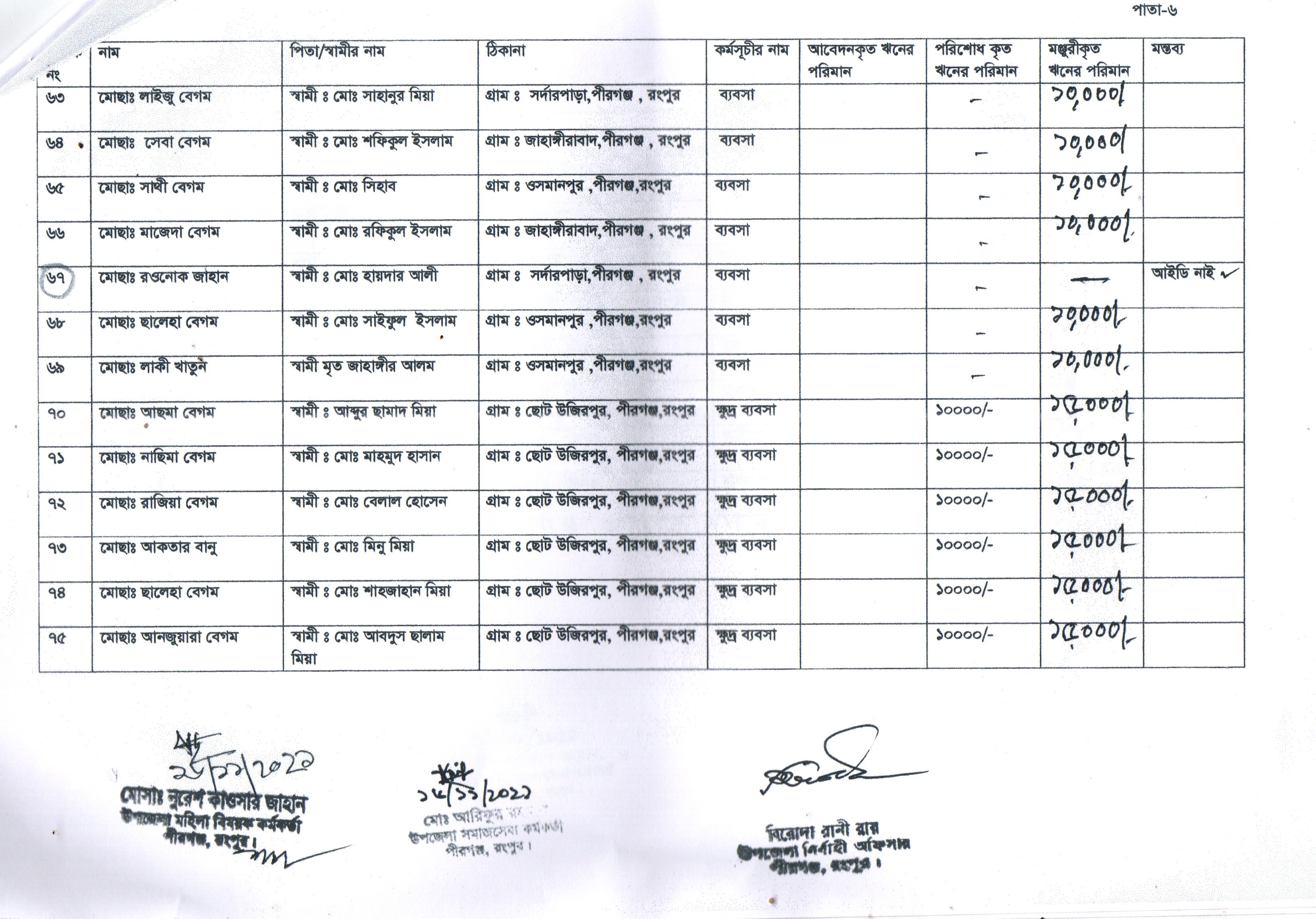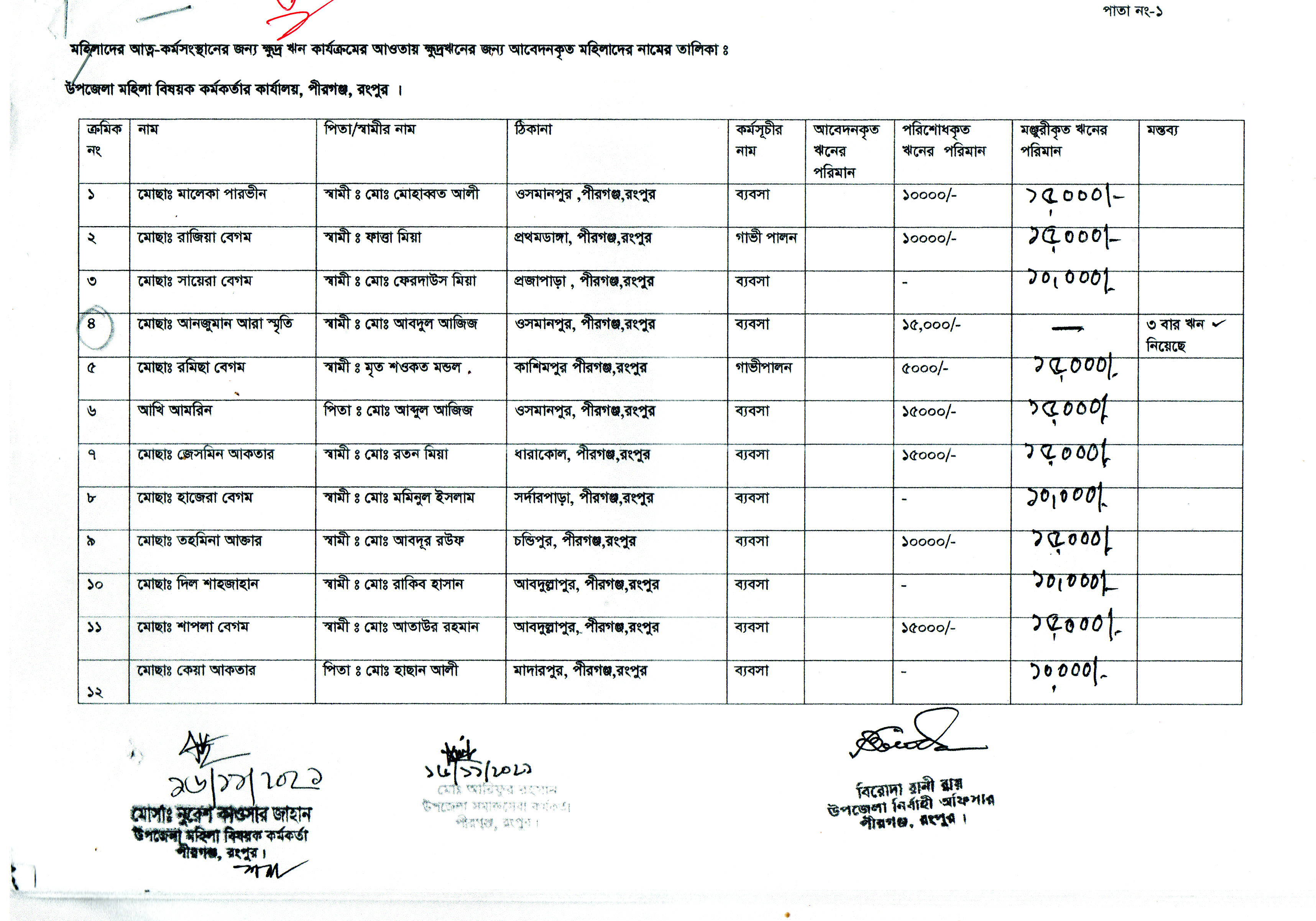 | ১ | মহিলাদের আত্ব কর্মসংস্থানের জন্য ক্ষুদ্রঋন কার্যক্রমের আওতায় ক্ষুদ্রঋনের জন্য আবেদনকৃত মহিলাদের নামের তালিকা | দেখুন | |